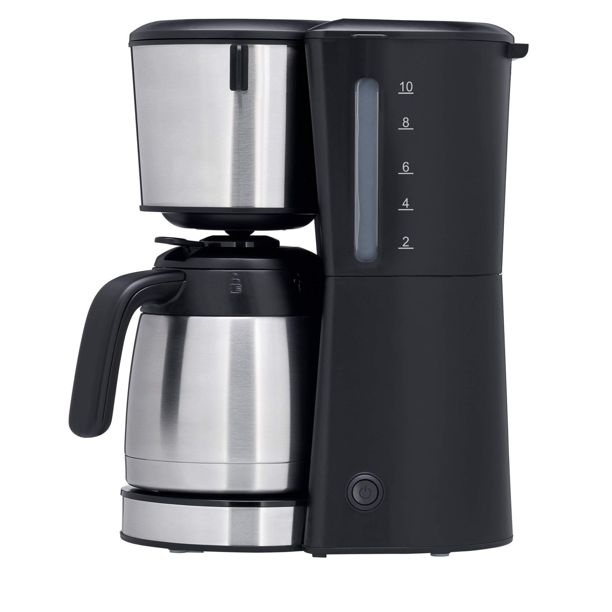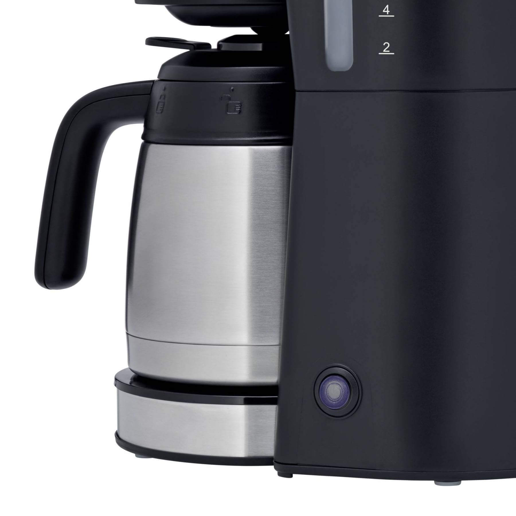 قهوه ساز دبلیو ام اف مدل WMF Bueno Pro Kaffeemaschine mit Thermoskanne matt با طراحی ساده و زیبا و محفظه ای با کیفیت بالا و روکش فولاد مات Cromargan® بدون هیچ زحمتی در هر فضای آشپزخانه جا می گیرد . عملیات نیز بدون زحمت و راحت انجام می شود . با کمک نشانگر سطح خارجی آب ، تقسیم بندی به اندازه فنجان دقیق است . حداکثر 10 فنجان 125 میلی لیتری هر یک از قهوه های معطر در قوطی ترمو قرار می گیرند ، که در صورت لزوم دمای ایده آل نوشیدن را برای ساعت ها حفظ می کند . و به لطف فیلتر گردان ، پودر قهوه را می توان به راحتی و بدون زحمت ریخت . سپس دکمه شروع / توقف (با چراغ نشانگر) را فشار دهید و هیچ چیز مانع لذت بردن از قهوه فوری شما نمی شود . قسمت فیلتر را می توان برای نظافت برداشته و به گونه ای طراحی شده است که قطره قطره یا سرریز نمی شود . سری صبحانه BUENO ترکیبی از مواد جاودانه ، ظریف و اشکال جذاب با عناصر مشکی است . BUENO دارای طراحی کاملاً شیک و مدرن است .